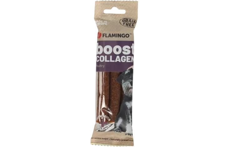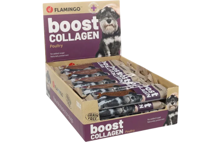 Verwen je hond met Boost rolletjes vol kip en collageen! Graanvrij en zonder toegevoegde suikers. Met collageen voor een gezonde huid en gewrichten, en een glanzende vacht. Bevat glucosamine en chondroitin voor extra ondersteuning.